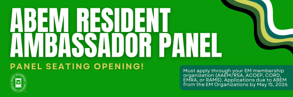 We have an upcoming vacancy on the Panel beginning in August 2026. Interested residents will need to apply through their Emergency Medicine membership organization (AAEM/RSA, ACOEP, CORD, EMRA, or RAMS). Reach out to your organization to get additional information, applications, and deadlines.